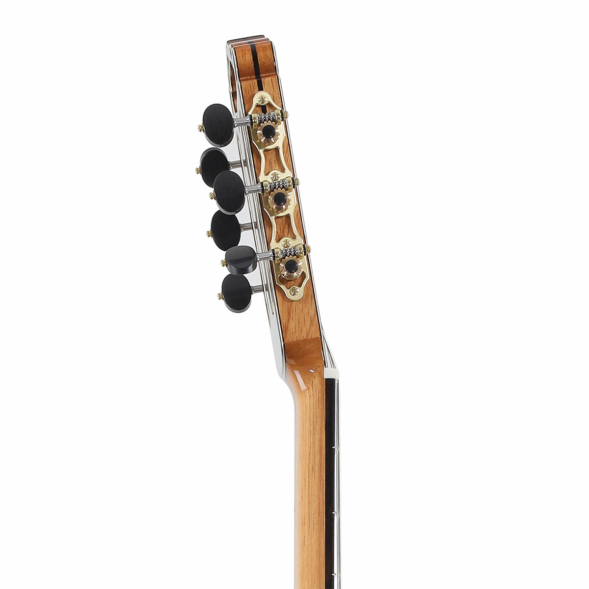 The pierced rosewood-maple-ziricote head and noble designer tuning machines by Nicoló Alessi underline the high demands that the HE Lattice makes on quality. This classical guitar impresses visually with its natural satin sealing on the soundboard, and body that has been finished with a UV-cured high-gloss varnish, gives the best of both worlds; highlighting the beauty of the ziricote with the high-gloss, reducing the cost and improving the durability by foregoing the french/shellac high-gloss on the soundboard.
